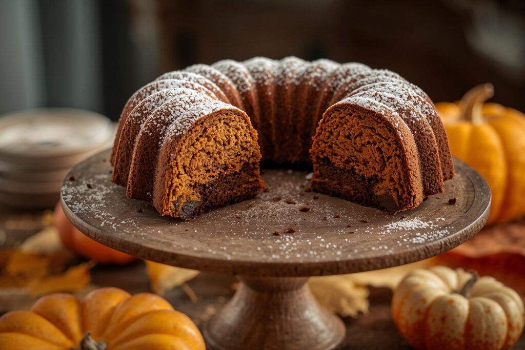 The Chocolate Pumpkin Bundt Cake is a stunning dessert that combines the earthy sweetness of pumpkin with the deep richness of cocoa. Its moist, tender crumb is infused with pumpkin purée and warm fall spices, while the chocolate elevates it into a decadent treat.