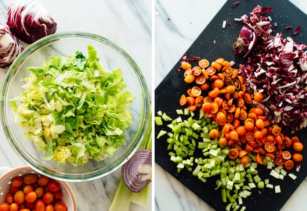 Step 2 – Chop & Arrange: Chop romaine lettuce into bite-sized pieces.Halve cherry tomatoes, slice cucumbers, peppers, and onions, and shred carrots.